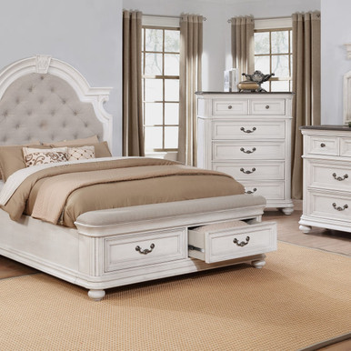 Then there’s the storage bench footboard. With its padded top and two cedar-lined drawers, this functional piece gives you loads of room to store blankets, shoes, or anything else.